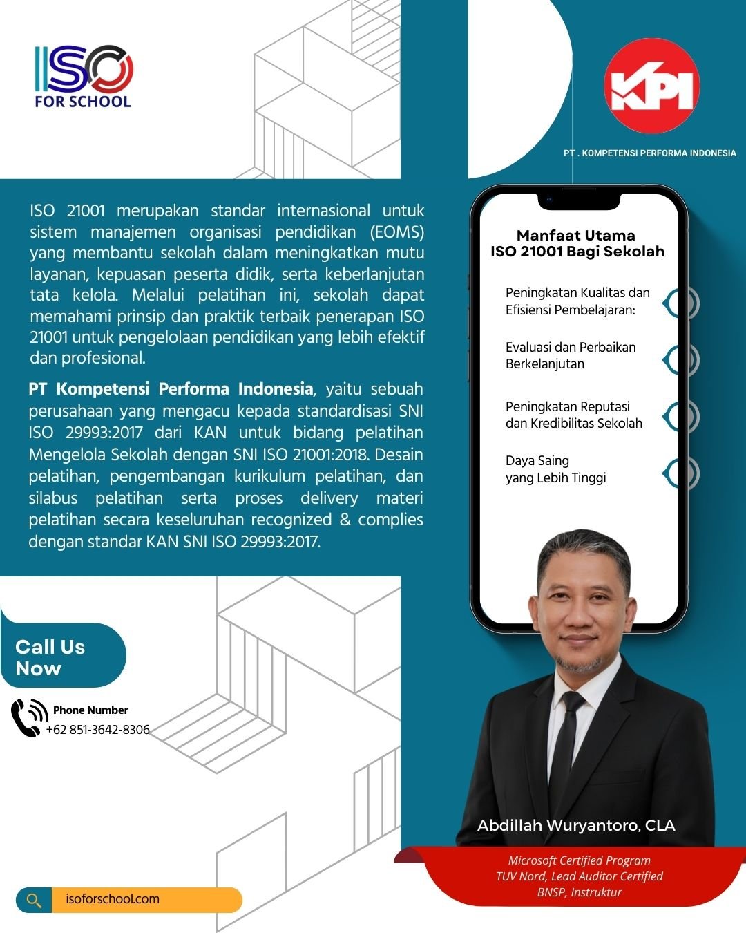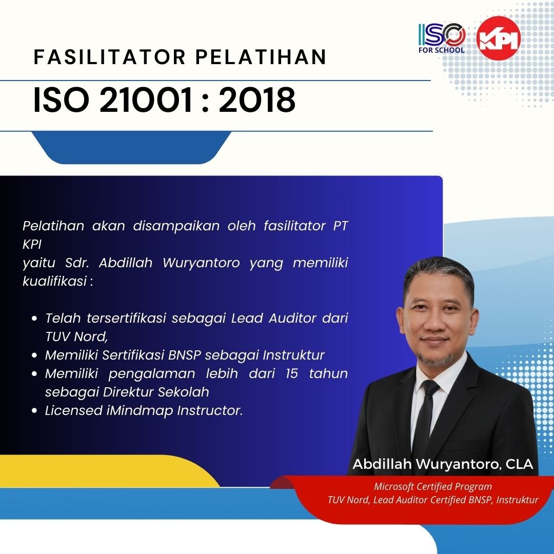 Peserta dapat memahami ISO 21001, menyusun dokumen mutu, dan memimpin sekolah dengan pengelolaan berbasis ISO 21001.